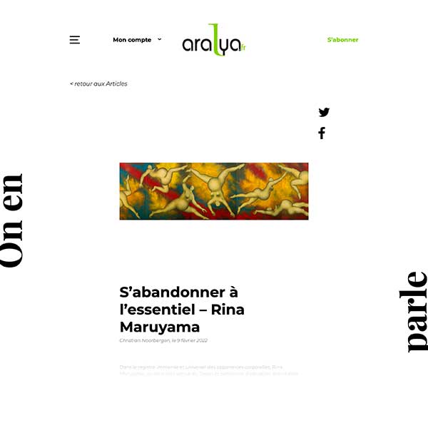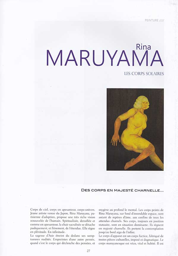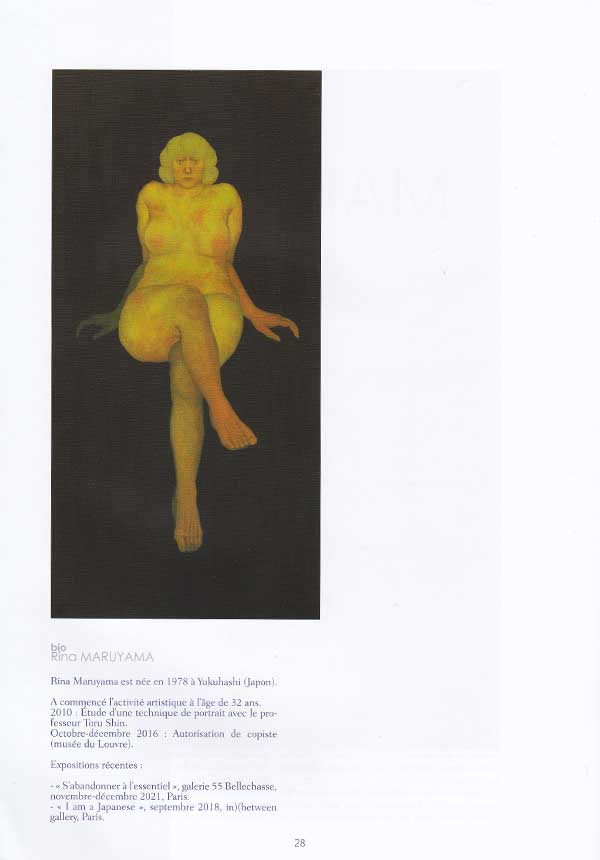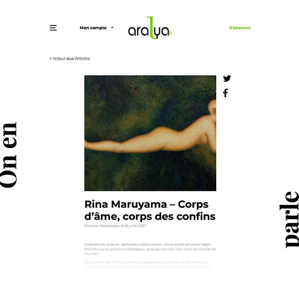 Rina Maruyana, a young artist from Japan, and Parisian by adoption, offers a very rich and renewed vision of humanity. Spiritualized, densified and as if in weightlessness, the sacred flesh detaches itself modestly, and proudly, from the expanse. It reigns in fullness. In infinity.